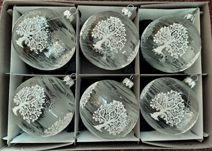 +420 731 683 257vanocniozdoby@slezska-tvorba.czSkleněná vánoční ozdoba ve tvaru koule, hladká, čirá, lesk, bílý dekor stromů, více velikostí. Foto ilustrační.