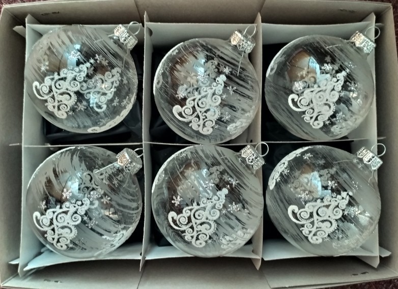 +420 731 683 257vanocniozdoby@slezska-tvorba.czSkleněná vánoční ozdoba ve tvaru koule, hladká, čirá, lesk, bílý dekor stromů, více velikostí. Foto ilustrační