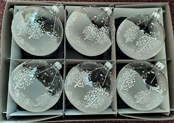 +420 731 683 257vanocniozdoby@slezska-tvorba.czSkleněná vánoční ozdoba ve tvaru koule, hladká, čirá, lesk, bílý dekor stromů, více velikostí. Foto ilustrační