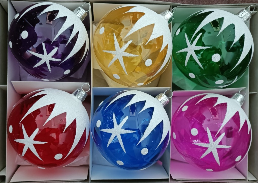 Skleněná vánoční ozdoba ve tvaru koule, hladká, průhledná, barva ass, lesk, bílý dekor, průměr koule 8 cm. Foto ilustrační. V krabici sortiment barev: červená, modrá, žlutá, zelená, růžová, fialová.