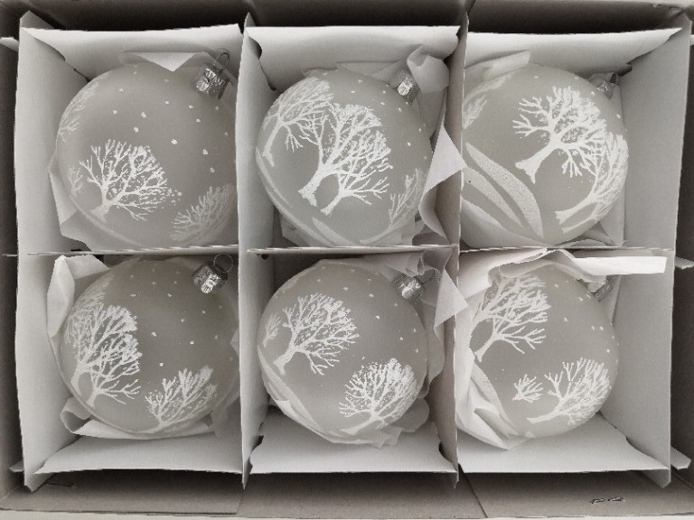 +420 731 683 257vanocniozdoby@slezska-tvorba.czSkleněná vánoční ozdoba ve tvaru koule, hladká, bílá průhledná, mat, dekor stromů, více velikostí. Foto ilustrační
