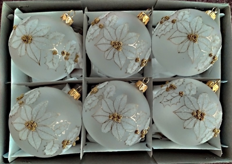 Skleněná vánoční ozdoba ve tvaru koule, hladká, průhledná, bílá, mat, středem koule bohatý bílozlatý plastický dekor/květ, více velikostí. Foto ilustrační