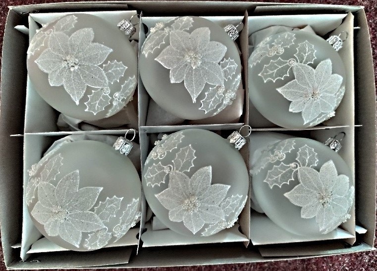 +420 731 683 257vanocniozdoby@slezska-tvorba.czSkleněná vánoční ozdoba ve tvaru koule, hladká, průhledná, bílá, mat, středem dekor/bílý květ, více velikostí. Foto ilustrační