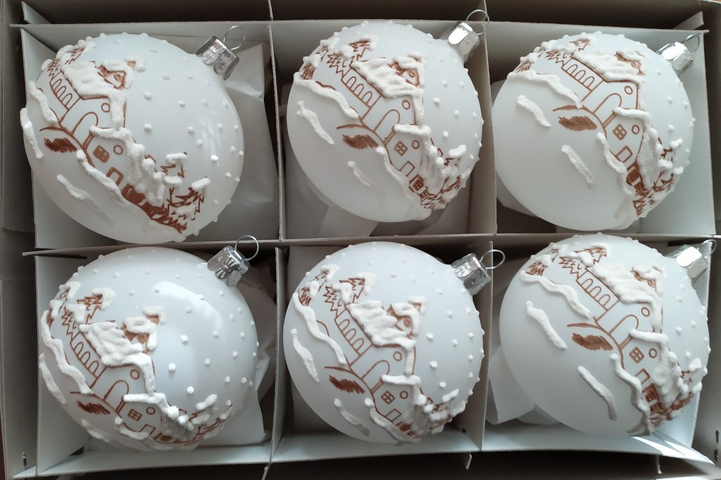 +420 731 683 257vanocniozdoby@slezska-tvorba.czKoule, hladká, bílá, mat/skořápka, plastický dekor, vesnička, více velikostí, foto ilustrační.