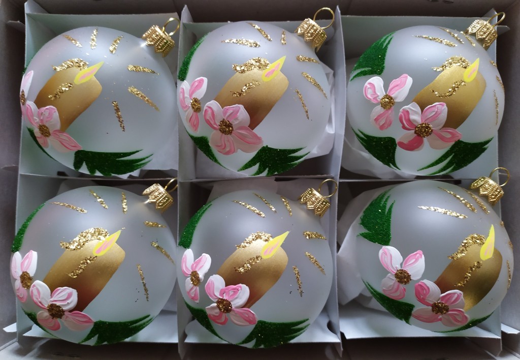 +420 731 683 257vanocniozdoby@slezska-tvorba.czSkleněná vánoční ozdoba, koule, hladká, průhledná, bílá, mat/lesk, ručně malovaný retro dekor, zlatá svíčka, foto ilustrační, více velikostí.