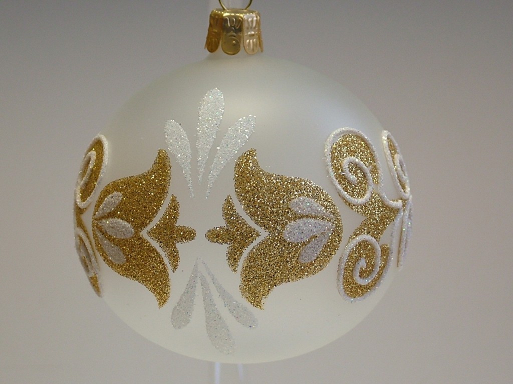 Skleněná vánoční ozdoba ve tvaru koule, hladká, průhledná, smáčená v bílém matu, zlatobílý dekor, motiv tulipánů se stonky. Foto ilustrační