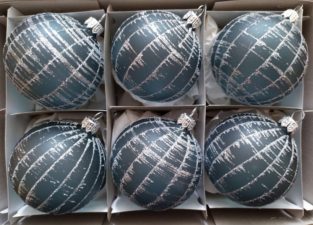 Skleněná vánoční ozdoba ve tvaru koule, hladká, šedá průhledná, mat, dekor, více velikostí. Foto ilustrační