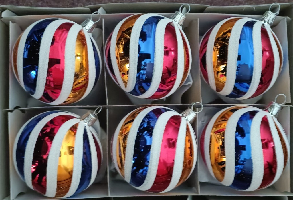 Skleněná vánoční ozdoba ve tvaru koule, hladká, barva ass (zlatá, červená, modrá), lesk, retro dekor. Více velikostí. Foto ilustrační.