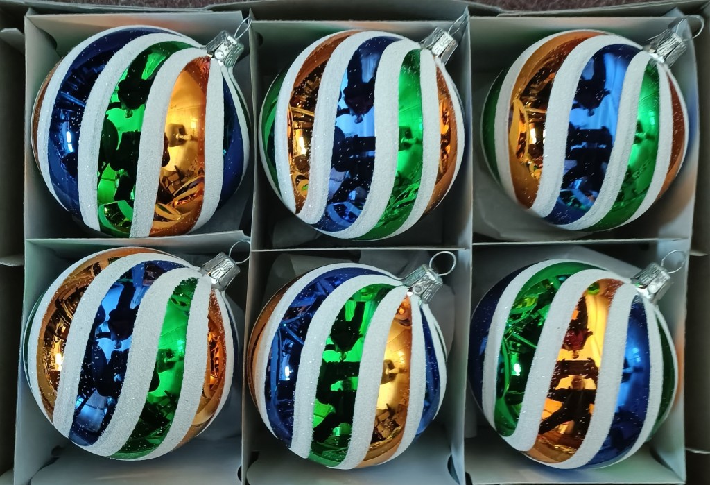 Skleněná vánoční ozdoba ve tvaru koule, hladká, barva ass (zlatá, zelená, modrá), lesk, retro dekor. Více velikostí. Foto ilustrační.