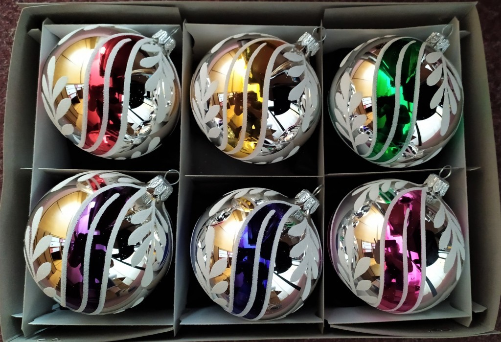 Skleněná vánoční ozdoba ve tvaru koule, hladká, stříbrná, barva ass, lesk, malovaný dekor, kombinace esíček a lístků. Foto ilustrační. (sortiment barev: červená, modrá, žlutá, zelená, růžová, fialová)