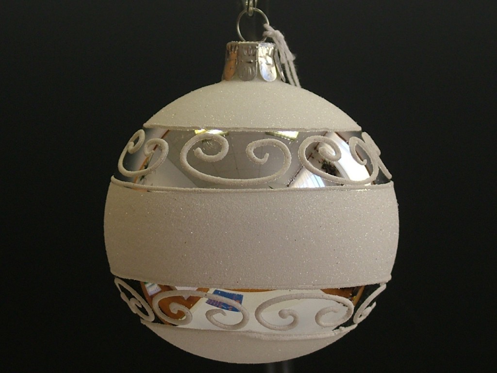 +420 731 683 257vanocniozdoby@slezska-tvorba.czSkleněná vánoční ozdoba ve tvaru koule, hladká, stříbrná, lesk, bílý plastický dekor, více velikostí. Foto ilustrační