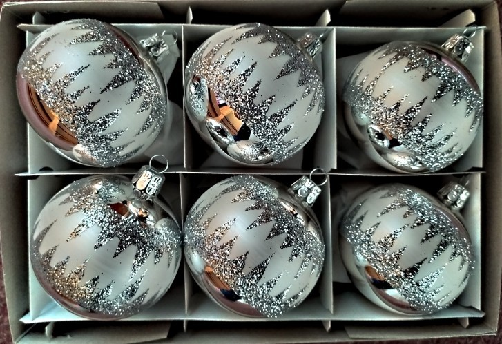 Skleněná vánoční ozdoba ve tvaru koule, hladká, stříbrná, středem stříbrný sypaný dekor, více velikostí. Foto ilustrační