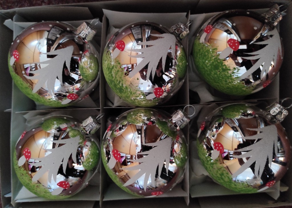 Skleněná vánoční ozdoba ve tvaru koule, hladká, stříbrná, lesk, malovaný dekor, motiv stromy, houby. Foto ilustrační