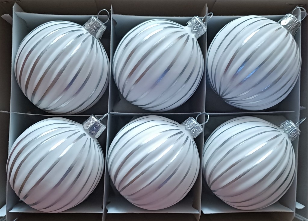 Skleněná vánoční ozdoba ve tvaru koule, forma, bílá skořápka, ručně malovaný stříbrný dekor. Foto ilustrační