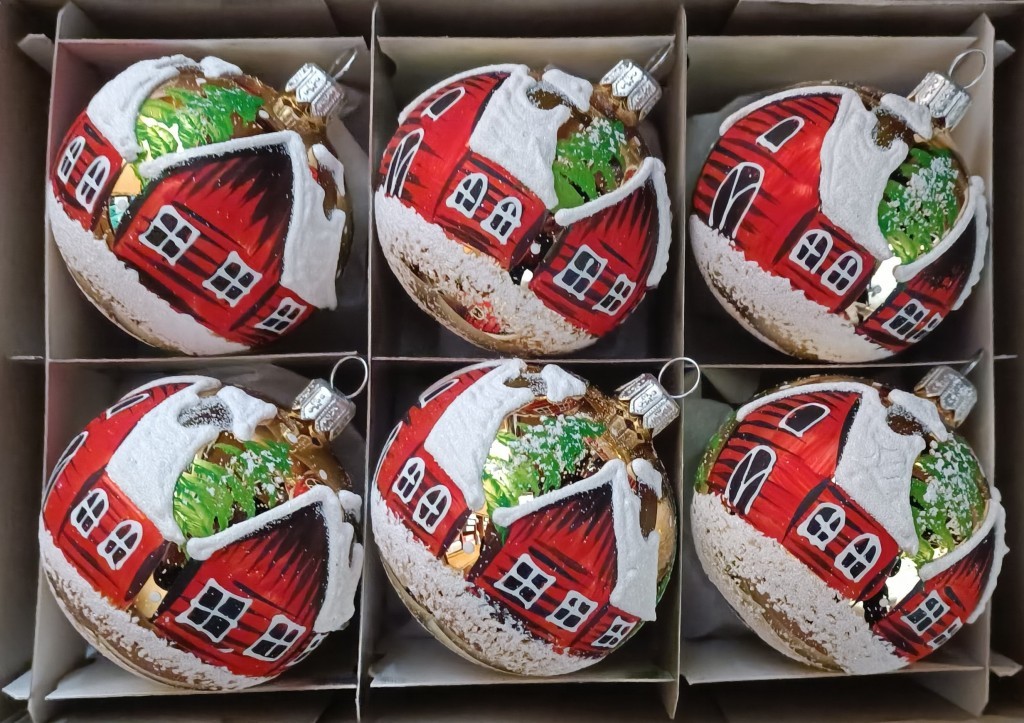 +420 731 683 257vanocniozdoby@slezska-tvorba.czSkleněná vánoční ozdoba ve tvaru koule, hladká, zlatá, lesk, ručně malovaný plastický zimní dekor s domky, více velikostí. Foto ilustrační