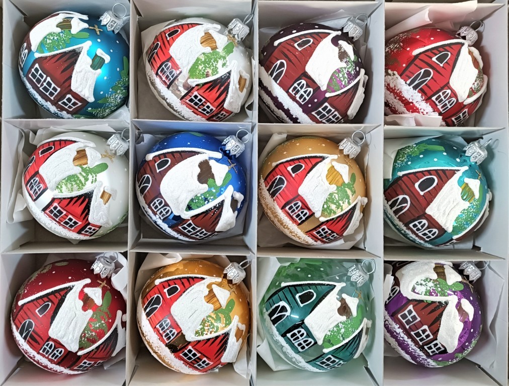 Skleněná vánoční ozdoba ve tvaru koule, sortiment, hladká, barva ass lesk/mat, ručně malovaný plastický zimní motiv s domky, více velikostí. Foto ilustrační