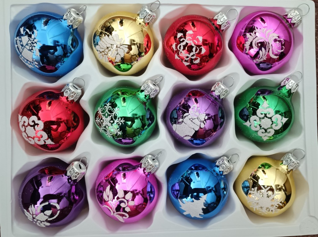 Skleněná vánoční ozdoba ve tvaru koule, hladká, sortiment, barva, varianty bílých dekorů, velikost 5 cm. Foto ilustrační.