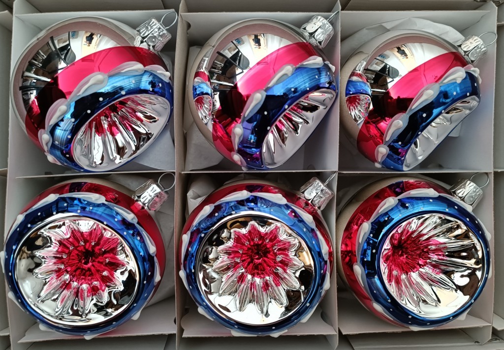 Skleněná vánoční ozdoba ve tvaru koule, tlačený reflektor, stříbrná, lesk, barevný dekor. Foto ilustrační, velikost 7 cm.