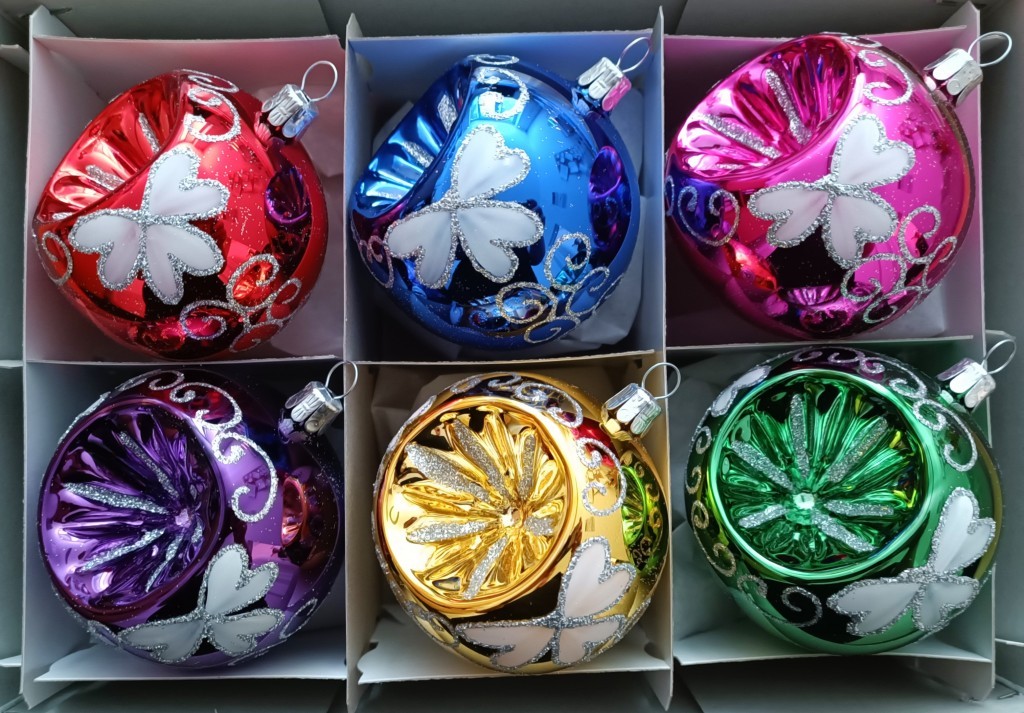 Skleněná vánoční ozdoba ve tvaru koule, 1x tlačený reflektor, barva ass, lak, dekor trojlístku, velikost 7 cm. Foto ilustrační.