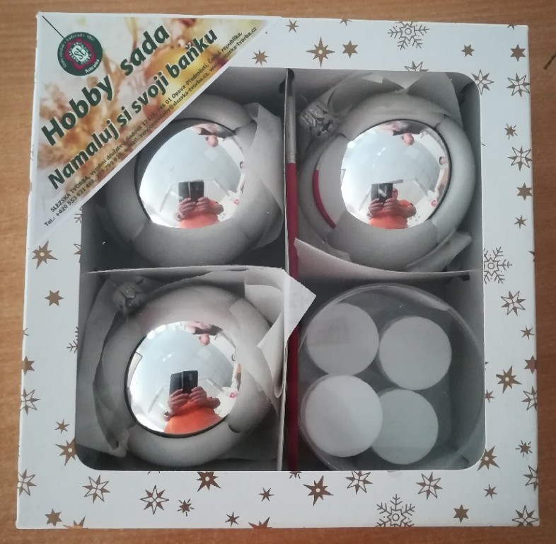 Kreativní (hobby) sada určená k výrobě vlastní unikátní ozdoby nejen na vánoční stromeček, ve stříbrném provedení, foto ilustrační. Sada obsahuje 3 ks stříbrných skleněných koulí velikost 8 cm, lepidlo Duvilax, štětec, 3x barevné třpytky/glitry a návod.