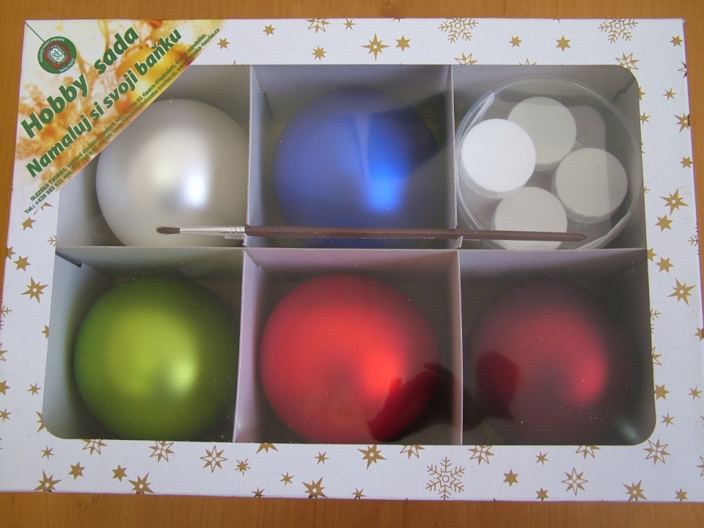 Kreativní (hobby) sada určená k výrobě vlastní unikátní ozdoby nejen na vánoční stromeček, v různých barevných kombinacích, každá originál svým složením, foto ilustrační. Sada obsahuje 5 ks barevných skleněných koulí velikost 8 cm, lepidlo Duvilax, štětec, 3x barevné třpytky/glitry a návod.