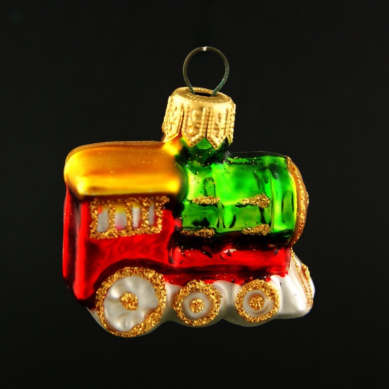Skleněná ozdoba, forma, ručně zdobená, lokomotiva, mat/lesk, velikost 5 cm. Foto ilustrační, dekor a barva na figurce se může lišit