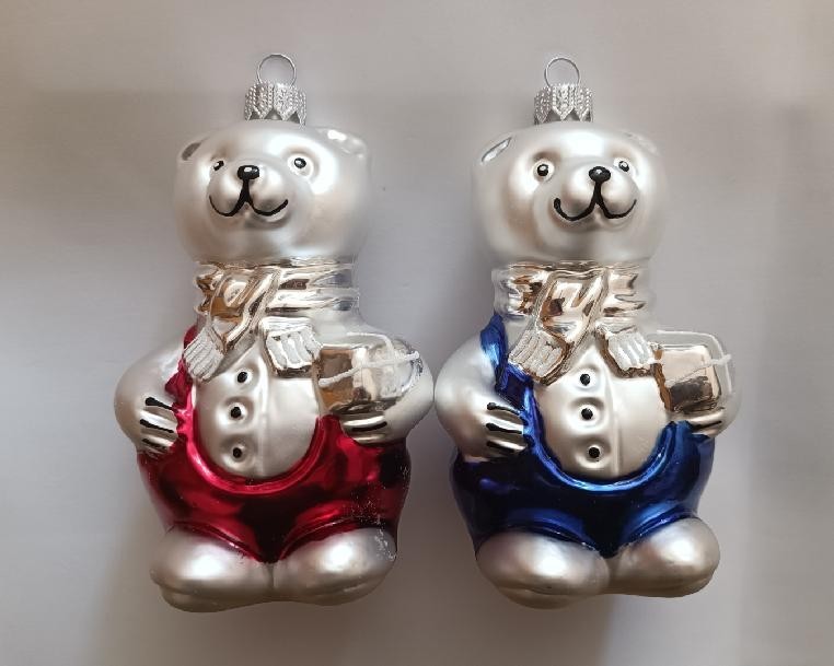Skleněná vánoční ozdoba, forma, medvěd Míša Kulička, lesk/mat, barva, dekor. Foto ilustrační