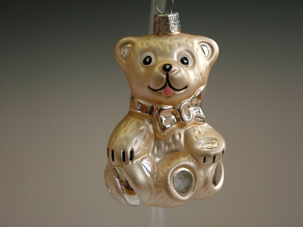 Skleněná vánoční ozdoba, forma, medvěd s balonkem, mat, šampaň, dekor. Foto ilustrační