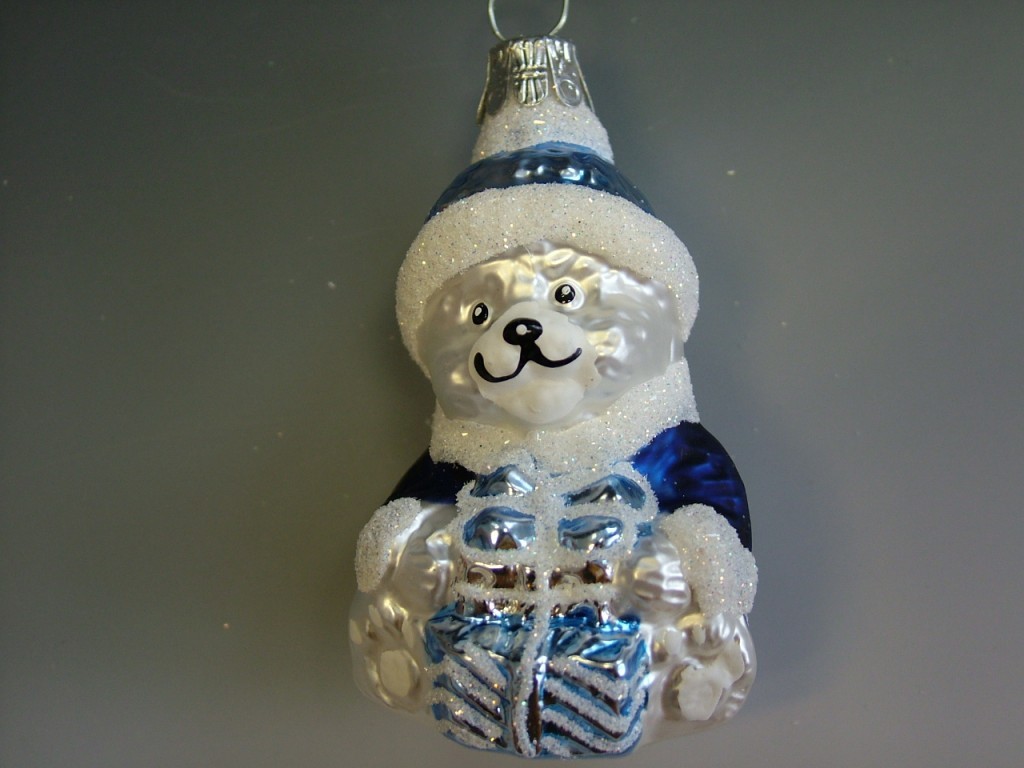 Skleněná vánoční ozdoba, forma, medvěd s dárkem malý, mat, barva bílo-modrá, dekor. Foto ilustrační
