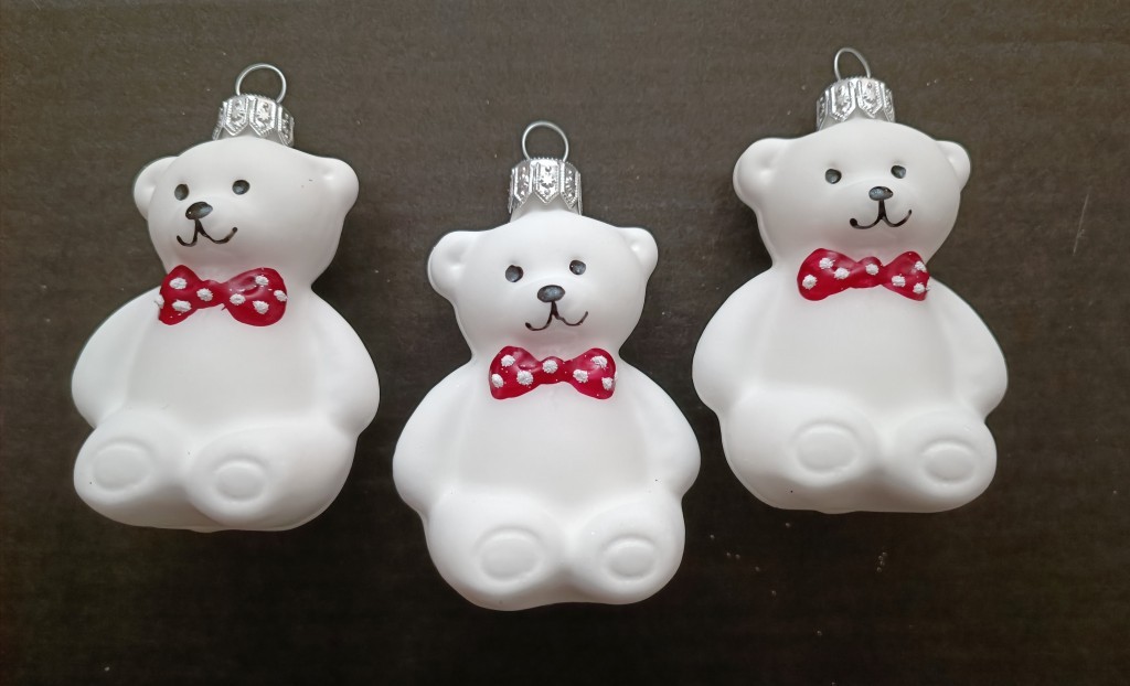 +420 731 683 257vanocniozdoby@slezska-tvorba.czSkleněná vánoční ozdoba, forma, medvěd sedící s mašlí, bílý, skořápka, červená mašle, foto ilustrační