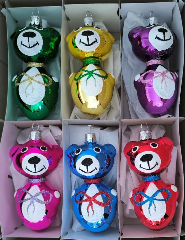 +420 731 683 257vanocniozdoby@slezska-tvorba.czSkleněná vánoční ozdoba, medvídek retro, volně foukaný tvar, lesk, barevný retro dekor, ass/6 barev - červená, modrá, zelená, fialová, zlatá, růžová, foto ilustrační.