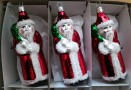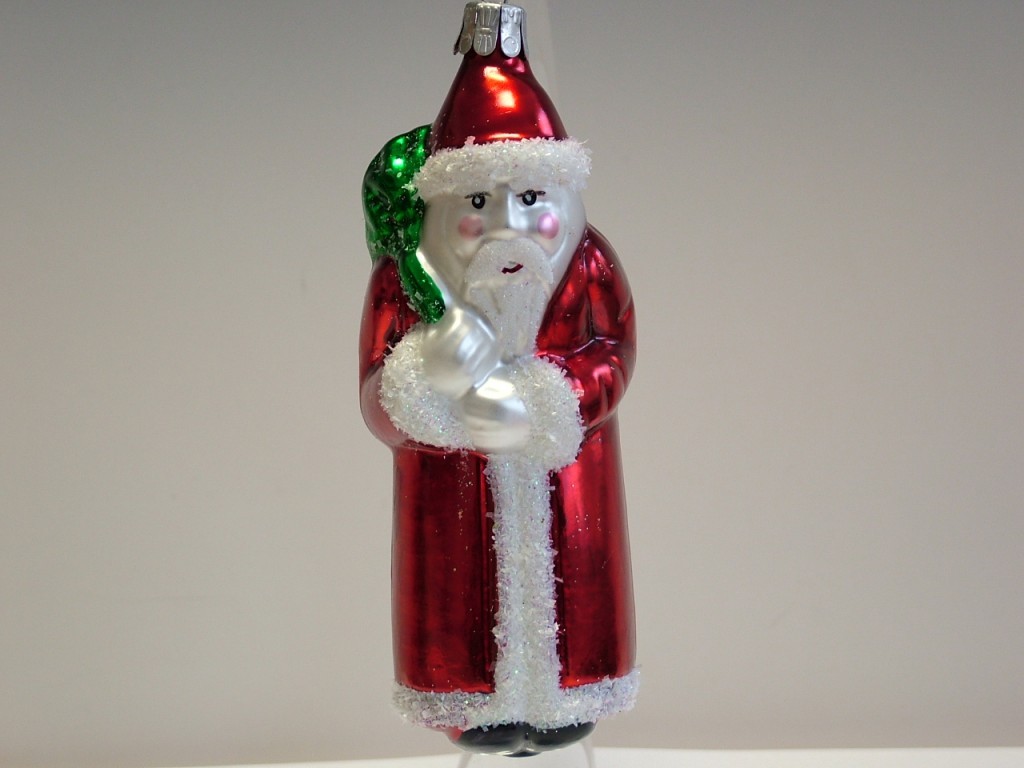 Skleněná vánoční ozdoba, forma, Mikuláš dlouhý s pytlem, mat, barevný dekor, bílé lemování, velikost 11 cm. Foto ilustrační
