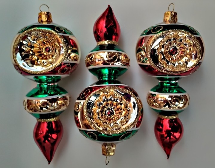 Skleněná vánoční ozdoba, volně foukaný tvar, obrácená věž s reflektorem, barva ass, lesk, malovaný dekor, velikost 14x7 cm. Foto ilustrační.