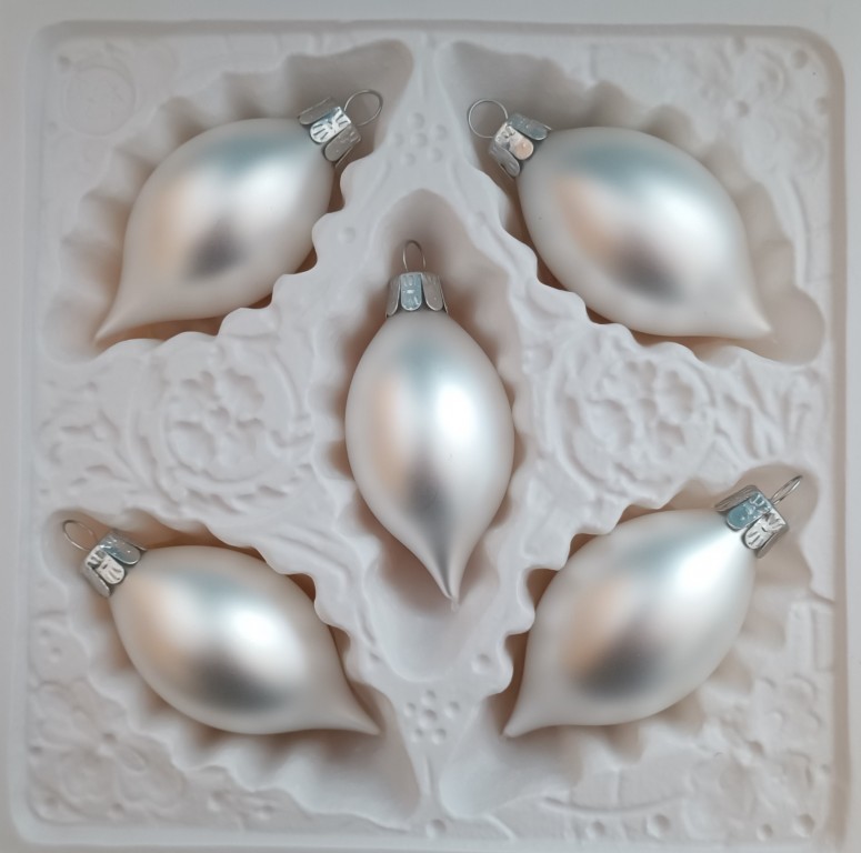 Skleněná vánoční ozdoba ve tvaru olivy, hladká, stříbřená, bílá, mat, bez dekoru, velikost 8x4 cm, foto ilustrační