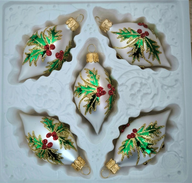 +420 731 683 257vanocniozdoby@slezska-tvorba.czSkleněná vánoční ozdoba ve tvaru olivy, hladká, bílá, mat, bohatý plastický dekor, velikost 8x4 cm, foto ilustrační