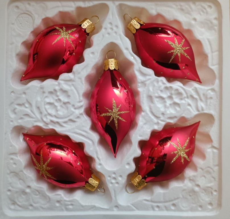 +420 731 683 257vanocniozdoby@slezska-tvorba.czSkleněná vánoční ozdoba ve tvaru olivy, hladká, červený lesk, zlatý dekor hvězd, velikost 8x4 cm, foto ilustrační