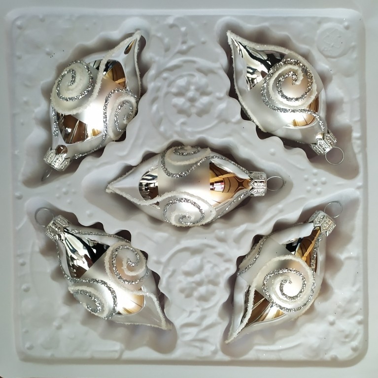 +420 731 683 257vanocniozdoby@slezska-tvorba.czSkleněná vánoční ozdoba ve tvaru olivy, hladká, stříbrná, střed bílým matem, plast. dekor, velikost 8x4 cm, foto ilustrační