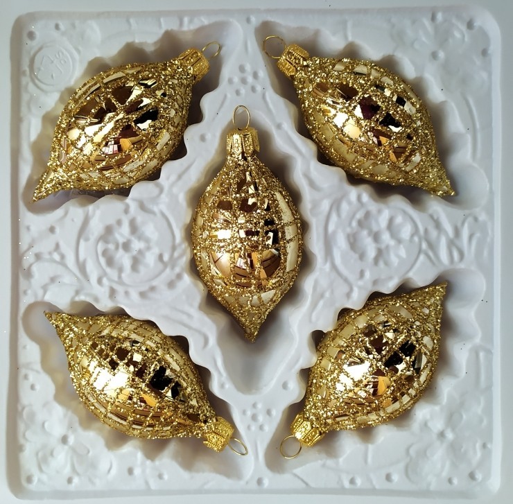 Skleněná vánoční ozdoba ve tvaru olivy, hladká, zlatá, lesk, plast. dekor, velikost 8x4 cm, foto ilustrační