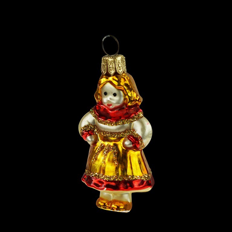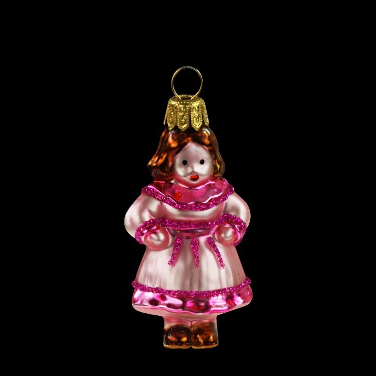 Skleněná ozdoba, forma, ručně zdobená, panenka, mat/lesk, velikost 6 cm. Foto ilustrační, dekor a barva na figurce se může lišit