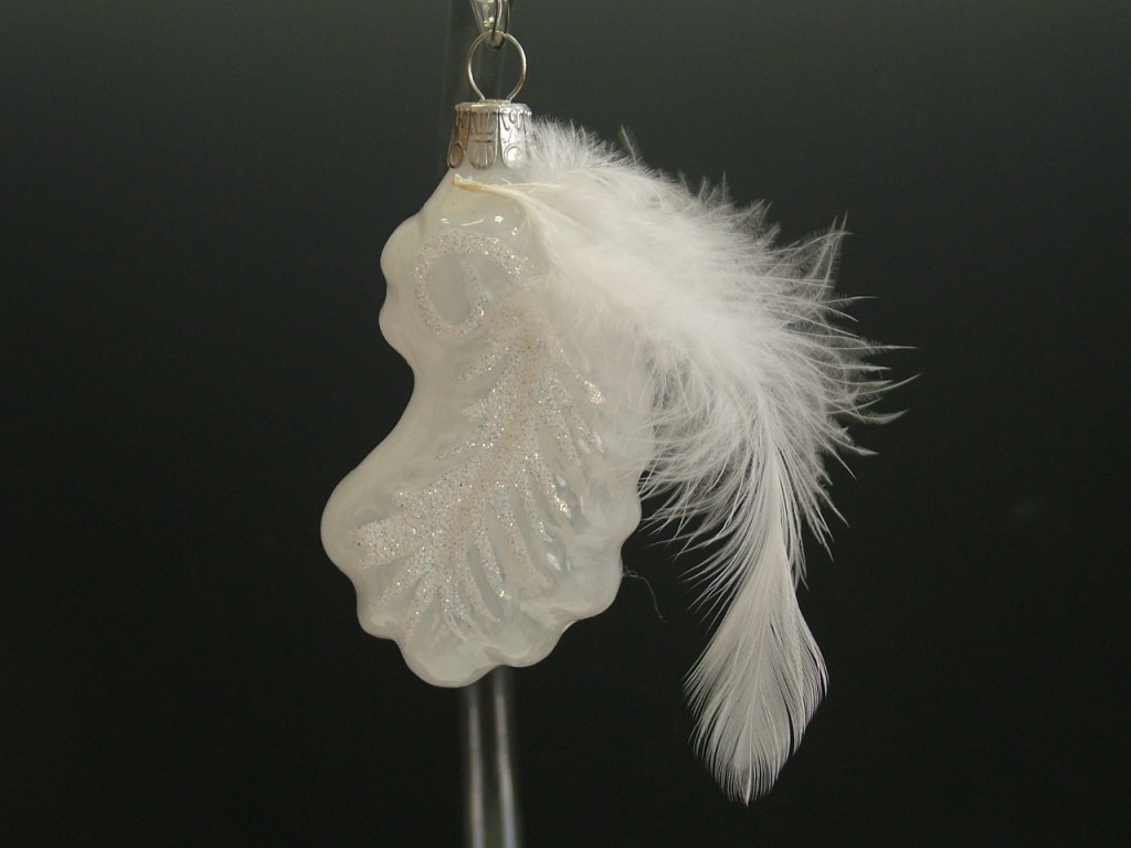 Skleněná vánoční ozdoba, forma, peříčko, průhledné,, bílé, lesk, dekor peří. Foto ilustrační