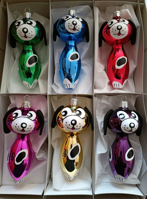 +420 731 683 257vanocniozdoby@slezska-tvorba.czSkleněná vánoční ozdoba, pes retro barevný, volně foukaný tvar, lesk, lepené uši, barevný retro dekor, více variant, ass/kombinace 6 barev - červená, modrá, zelená, fialová, zlatá, růžová, nebo jen zlatá, foto ilustrační.