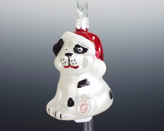 Skleněná vánoční ozdoba, forma, pes s čepicí, mat, bílý, dekor, velikost 7x5 cm. Foto ilustrační