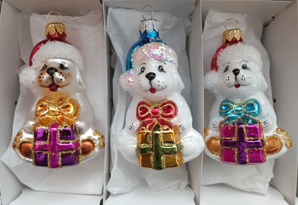 +420 731 683 257vanocniozdoby@slezska-tvorba.czSkleněná ozdoba, forma, ručně zdobená, pes s dárkem, bílý, velikost 9,5 cm, lesk/mat, foto ilustrační, barevný dekor