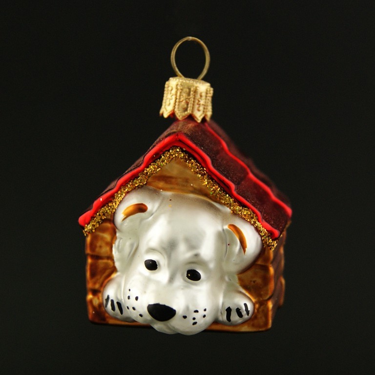 Skleněná ozdoba, forma, ručně zdobená, dětský motiv, pes u boudy, více variant, mat/lesk, velikost 5 cm. Foto ilustrační, dekor a barva na figurce se může lišit