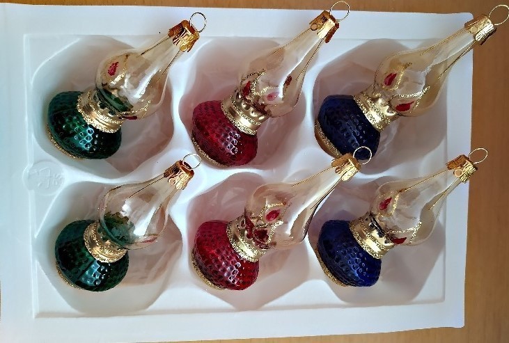 Skleněná vánoční ozdoba, forma, petrolejka malá, průhledná, sortiment barev červené, modré a zelené, lesk, dekor, velikost 8x4 cm. Foto ilustrační