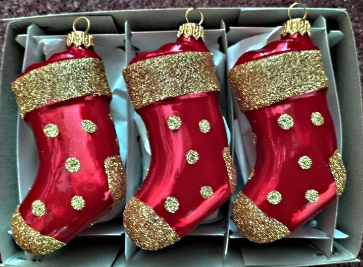 +420 731 683 257vanocniozdoby@slezska-tvorba.czSkleněná vánoční ozdoba, forma, ponožka, červená, porcelán, lesk, zlatý dekor, puntíky, velikost 11x6 cm. Foto ilustrační