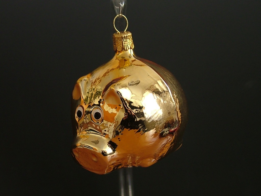 Skleněná vánoční ozdoba, forma, prasátko, zlaté, lesk, dekor, velikost 6,5x6 cm. Foto ilustrační