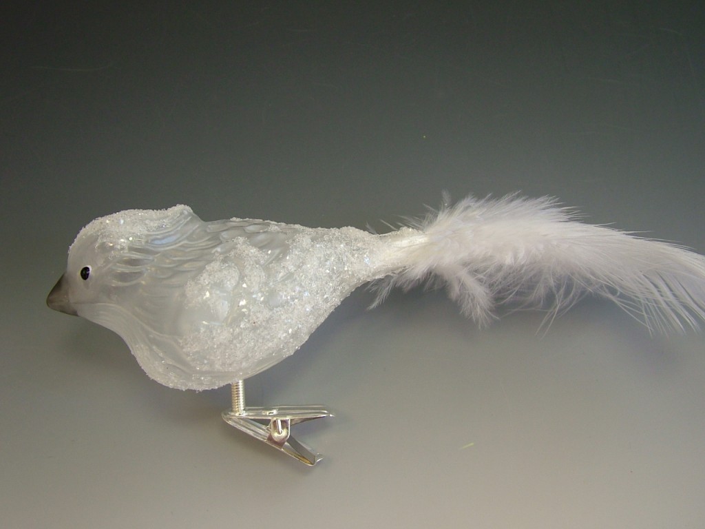 Skleněná vánoční ozdoba, forma, ptáček chocholka, průhledný, mat, bílý/114, dekor, velikost 10 cm bez peří. Foto ilustrační