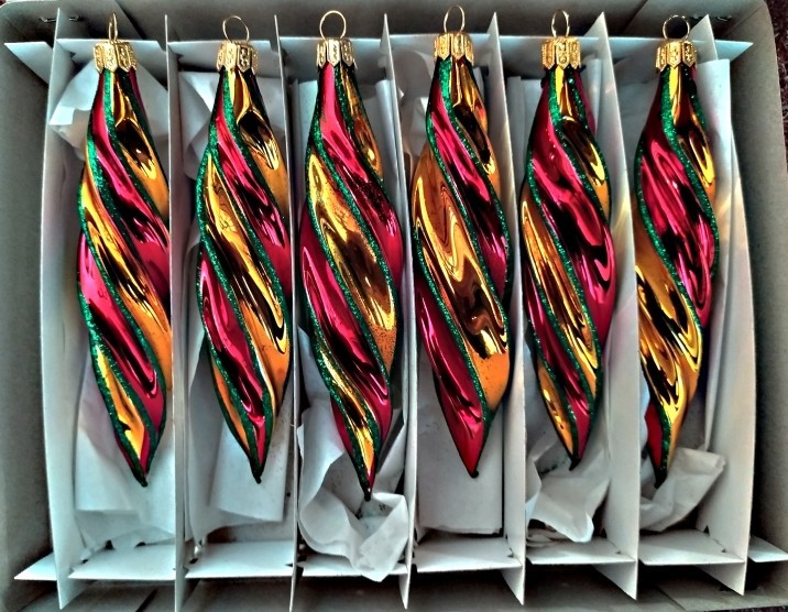 Skleněná vánoční ozdoba, volně foukaný tvar, raketa, kroucená, barevná, lesk, dekor, velikost 14x3 cm. Foto ilustrační