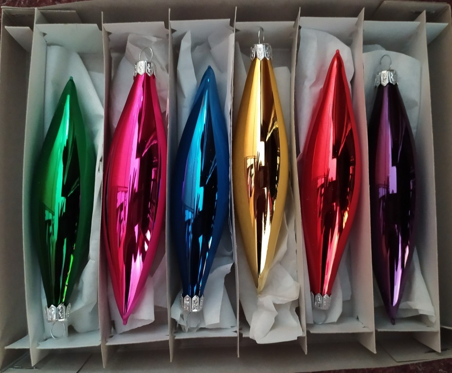 Skleněná vánoční ozdoba ve tvaru rakety, hladká, barva ass, lesk, bez dekoru, velikost 14x3 cm, (sortiment barev: červená, modrá, žlutá, zelená, růžová, fialová), foto ilustrační.